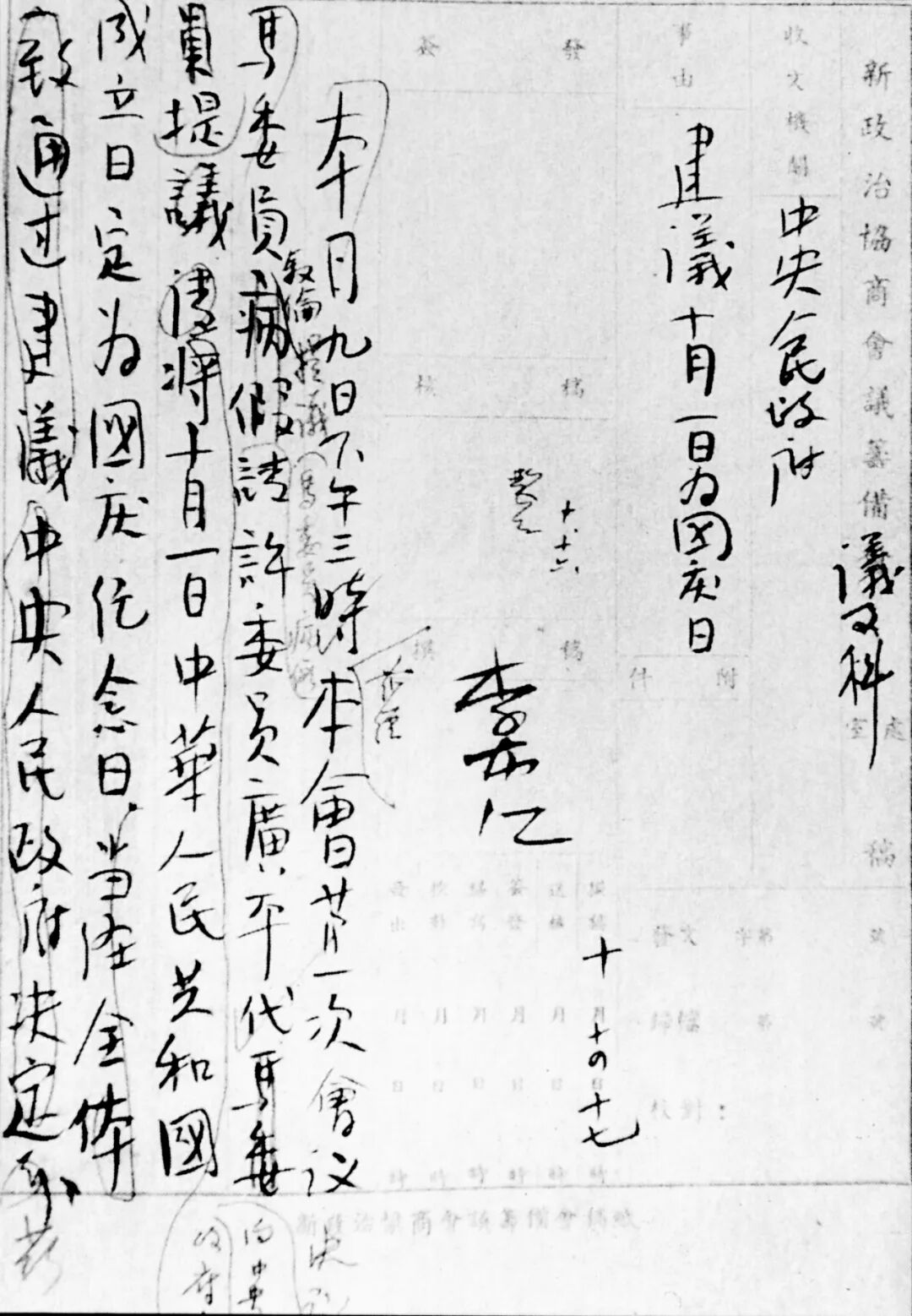 在新中国和中央人民政府成立之际,新中国的领袖们还没有来得及考虑“国庆”事宜。最早提出“国庆日”设想和提议的是马叙伦先生。