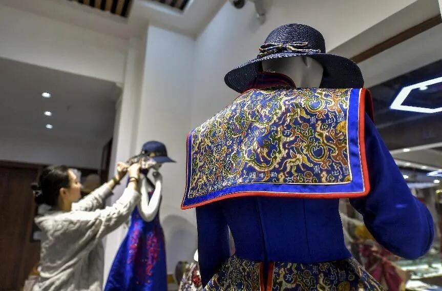 2024年1月11日,新疆乌鲁木齐市二道桥大巴扎非遗文创馆,工作人员在整理融入“五星出东方利中国”织锦护膊图案的服饰。中新社记者 刘新 摄
