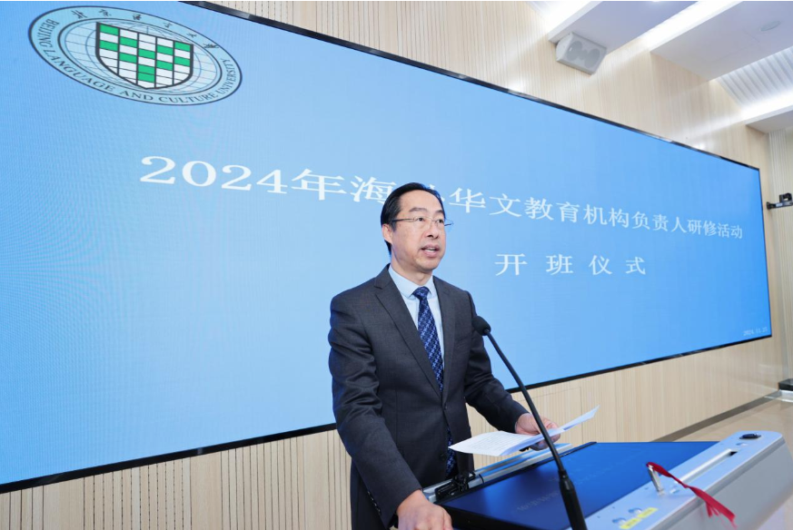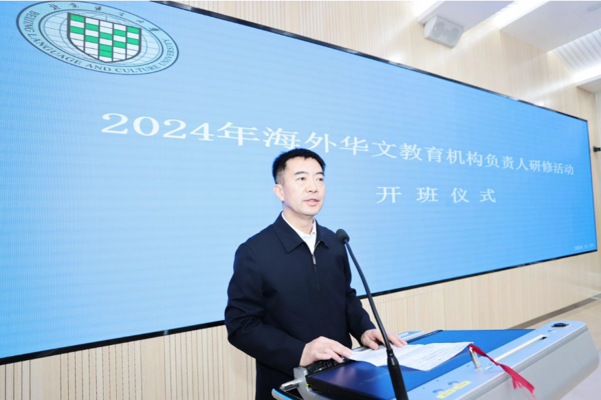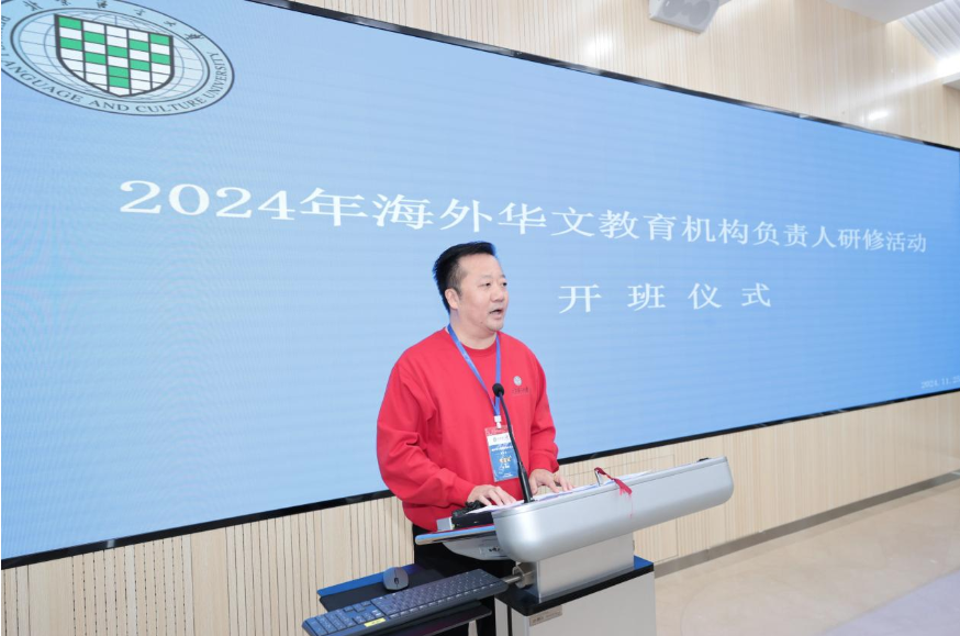 11月25日,由北京市人民政府侨务办公室主办,北京语言大学应用中文学院和中华文化国际传播中心联合承办的2024年海外华文机构负责人研修活动隆重开班。市侨办二级巡视员马东、侨务事务处处长林婕、侨务事务处副处长李峰、北京语言大学副校长黄益方、应用中文学院院长、中华文化国际传播中心主任苏英霞、应用中文学院院务委员会主任周鑫等领导嘉宾出席,来自全球17个国家的36位海外华文机构负责人参加了开班式。开班式由北京语言大学党外知识分子联谊会常务副会长吕静主持。