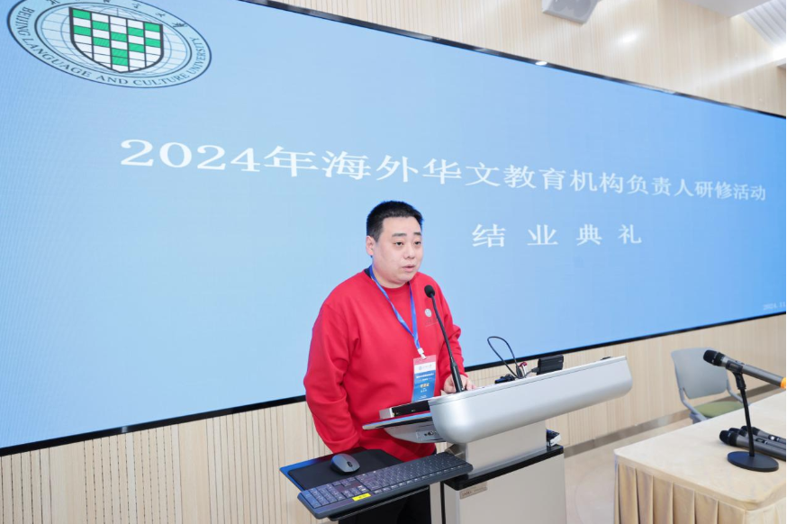 11月29日,2024年海外华文机构负责人研修活动结业典礼在北语教二楼101会议室举行。市侨办二级巡视员马东、侨务事务处处长林婕、北京语言大学应用中文学院院长、中华文化国际传播中心主任苏英霞、应用中文学院院务委员会主任周鑫等领导嘉宾出席,全体学员参加了结业典礼。典礼由北京语言大学党外知识分子联谊会常务副会长吕静主持。