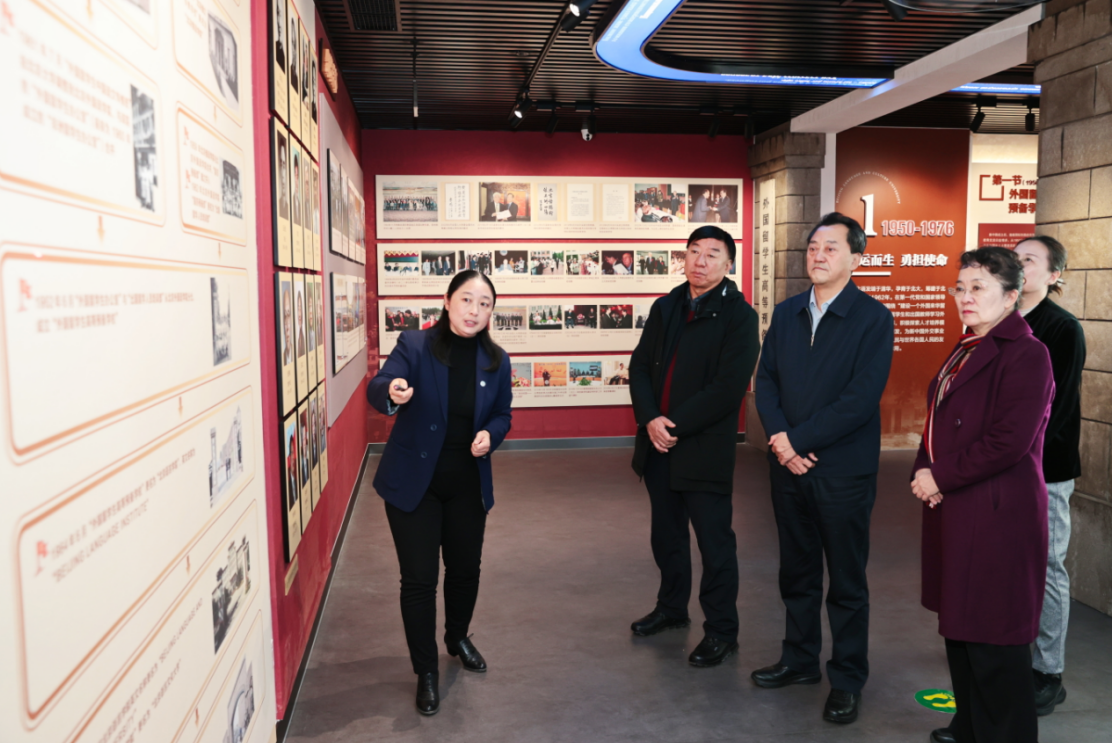 北京市政协民宗委一行首先前往北京语言大学校史馆,在学校档案馆馆长、校史馆馆长王立伟老师的生动解说下,回顾了北京语言大学60年来的重大事件、重要人物、重点史实,全面了解了学校的历史进程、发展成果与精神文化,深刻感受到学校鲜明的办学特色和厚重的文化底蕴。